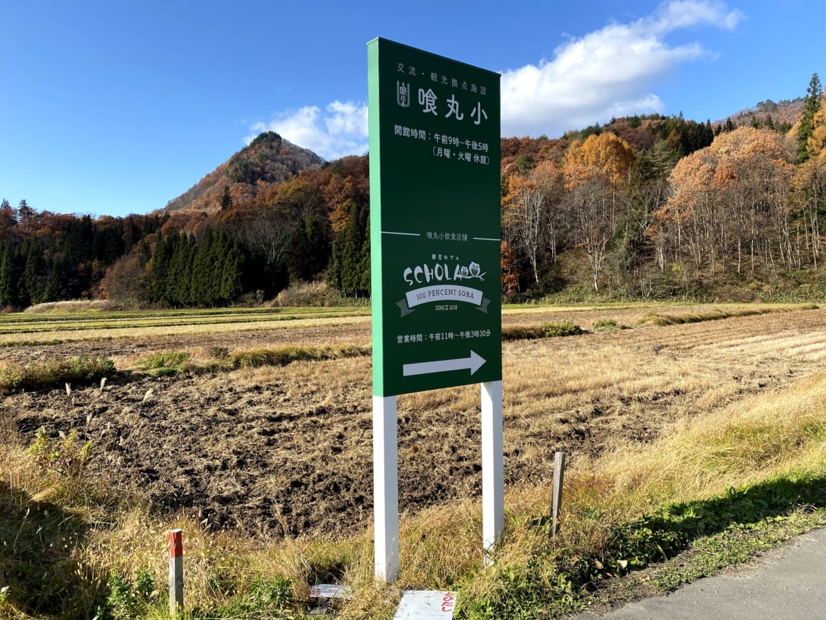 国道沿いにある喰丸小と蕎麦カフェSCHOLAの案内板
