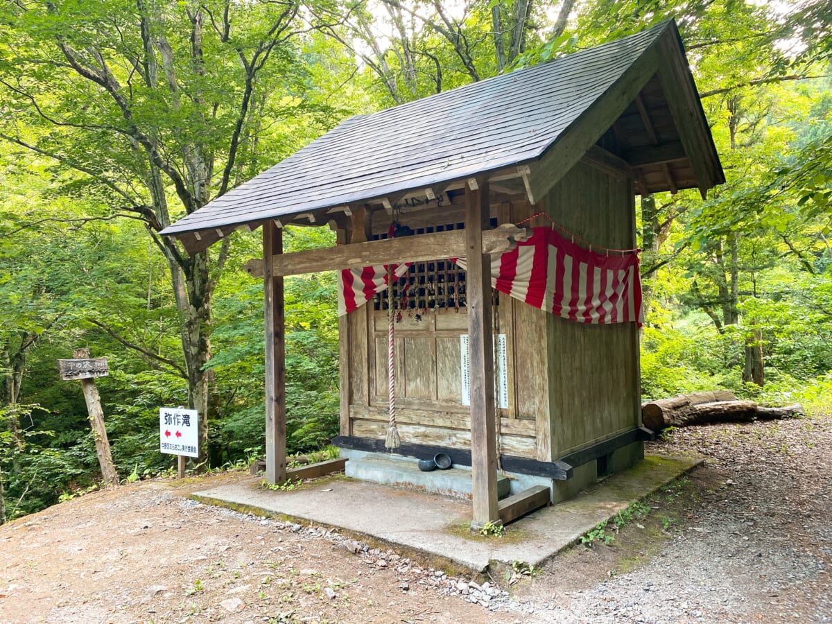 弥作滝前です。道沿いに社があって道祖神があり、椅子やベンチがあります。